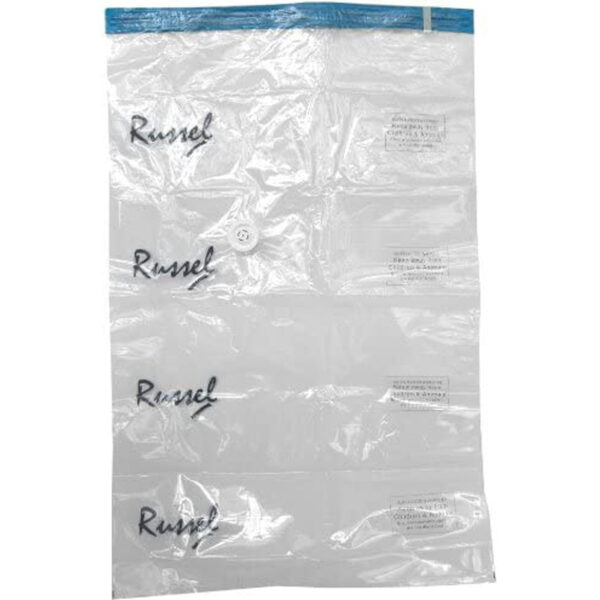 Another great range from the Russel collection. These vacuum bags will give you up to 3 times more space where you need it most. Store items such as duvets and pillows or cushions and curtains as well as clothing. Our bags are designed to fit around the home in wardrobes, cupboards, cellars, lofts, and garages They are completely reusable and suitable for all man-made fibers. Very easy to use, all bags have a wide opening to allow easy filling and zipper slider fastening to ensure the bags are sealed tightly. The majority of bags in the collection need a vacuum cleaner hose to remove air that compresses the bag. Also available is the “Roll Bag” which allows you to remove air simply by rolling tightly by hand. All bags have specialized valves and a patented one-way air passage allowing air to be removed but not absorbed, this keeps the contents airtight until you release the seal on the zipper which then allows the bag to re-inflate.