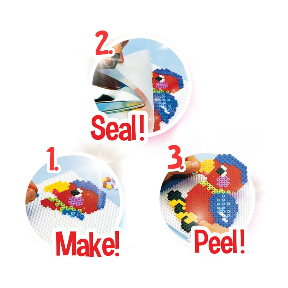 Place the beads on a pegboard following the design guide, or make up your own! Place the special ironing paper on top of the design and then iron for just a few seconds using smooth, circular movements. Never hold the iron completely still. After having applied the iron for a short period, the colour of the beads will suddenly be more clearly visible through the ironing paper; this means that the ironing is finished. Leave the design for a few minutes to cool down and then peel it off the pegboard. You now have a long lasting design!