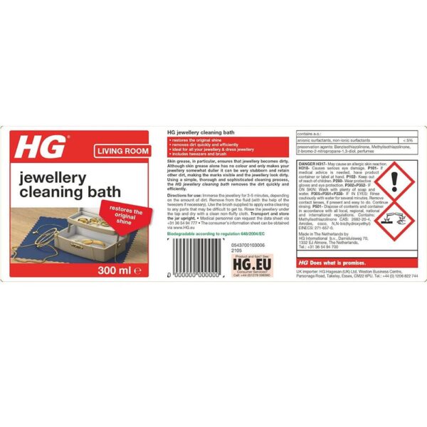 HG jewelry cleaning bath removes dirt quickly and efficiently so that jewelry looks shiny and clean again. Our jewelry cleaning bath is suitable for cleaning jewelry, including gold and silver jewelry and dress jewelry. With our jewellery cleaning bath dull bracelets, necklaces or earrings regain their original shine.