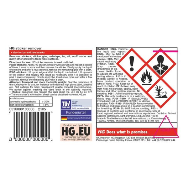 • Includes: 1 x HG Sticker Remover, 300ml. Discover the innovative range of HG professional household cleaning products, including HG mould remover, multi purpose cleaner sprays and all surface cleaners