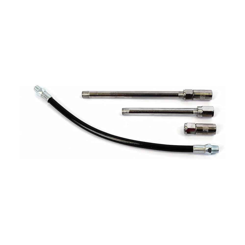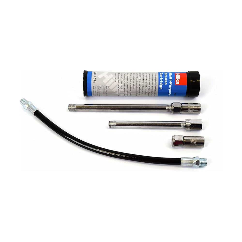 Versatile Manual Grease Gun Set designed to accommodate both cartridges and bulk grease. Includes a 10″ 1/2″ flexible hose, 7″ rigid extension, and a 4″ 1/2″ connector for grease nipples. Comes complete with a cartridge and is compatible with Hilka cartridges.