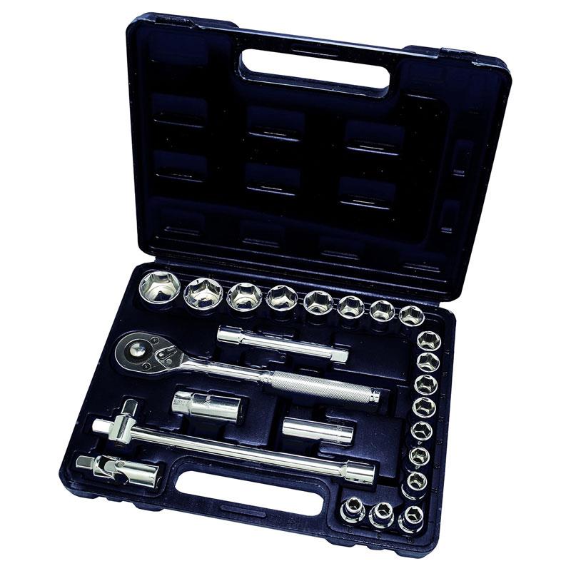• Complete 25pc Set – Includes sockets 8–32mm, ratchet, extensions, adapters & spark plug sockets.