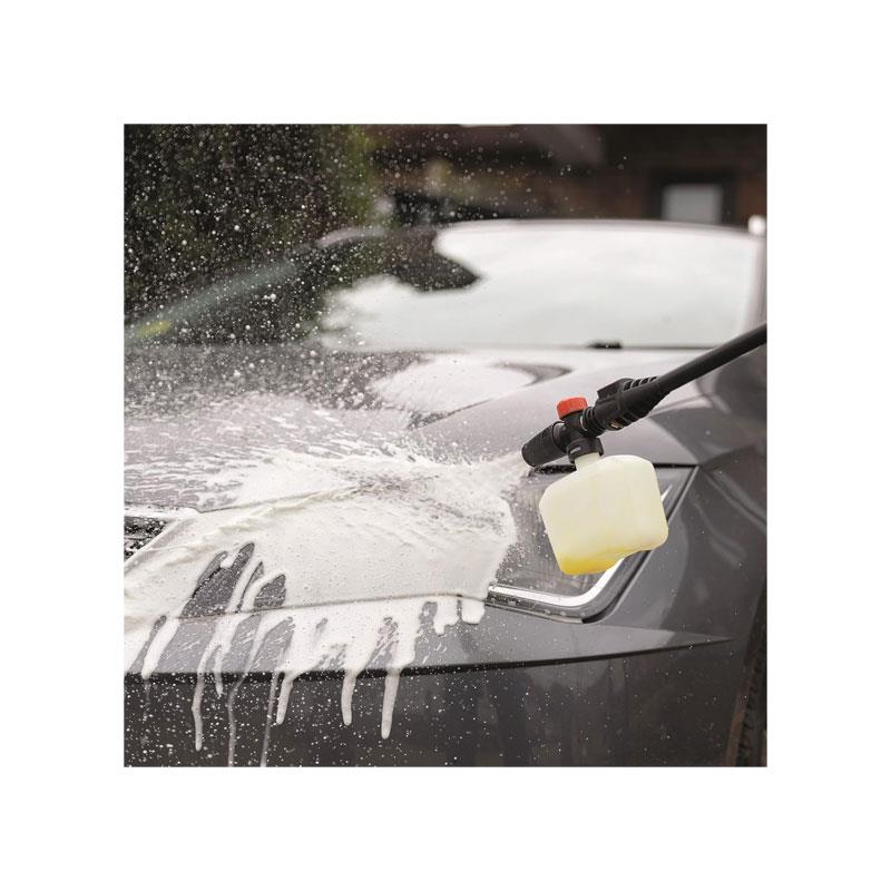 This pressure washer features a power control lance that allows you to adjust pressure depending on the surface, protecting delicate areas while providing strong force for stubborn dirt. The quick-release head system ensures fast switching between accessories, including an adjustable high-pressure nozzle, turbo nozzle, foam bottle, fixed brush, and patio brush for complete cleaning flexibility.