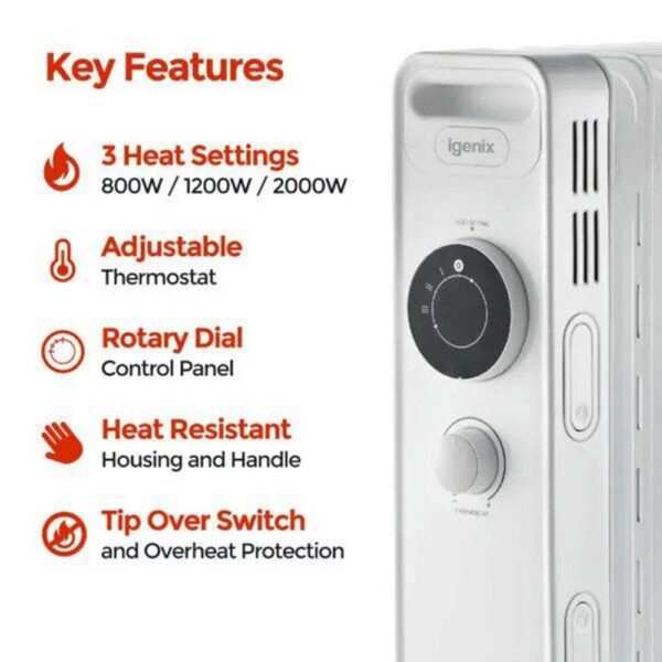 Igenix 9 Fin Oil Filled Radiator With 3 Heat Settings And Overheat Protection 2000W - White - Image 5