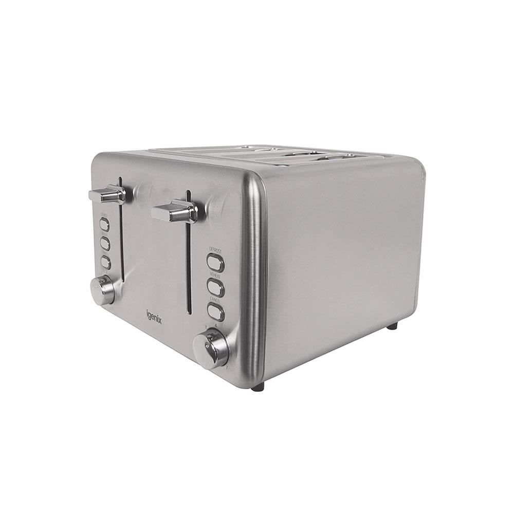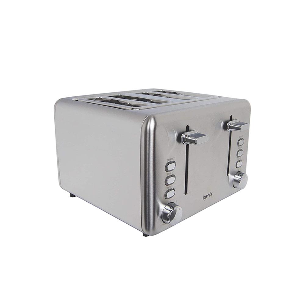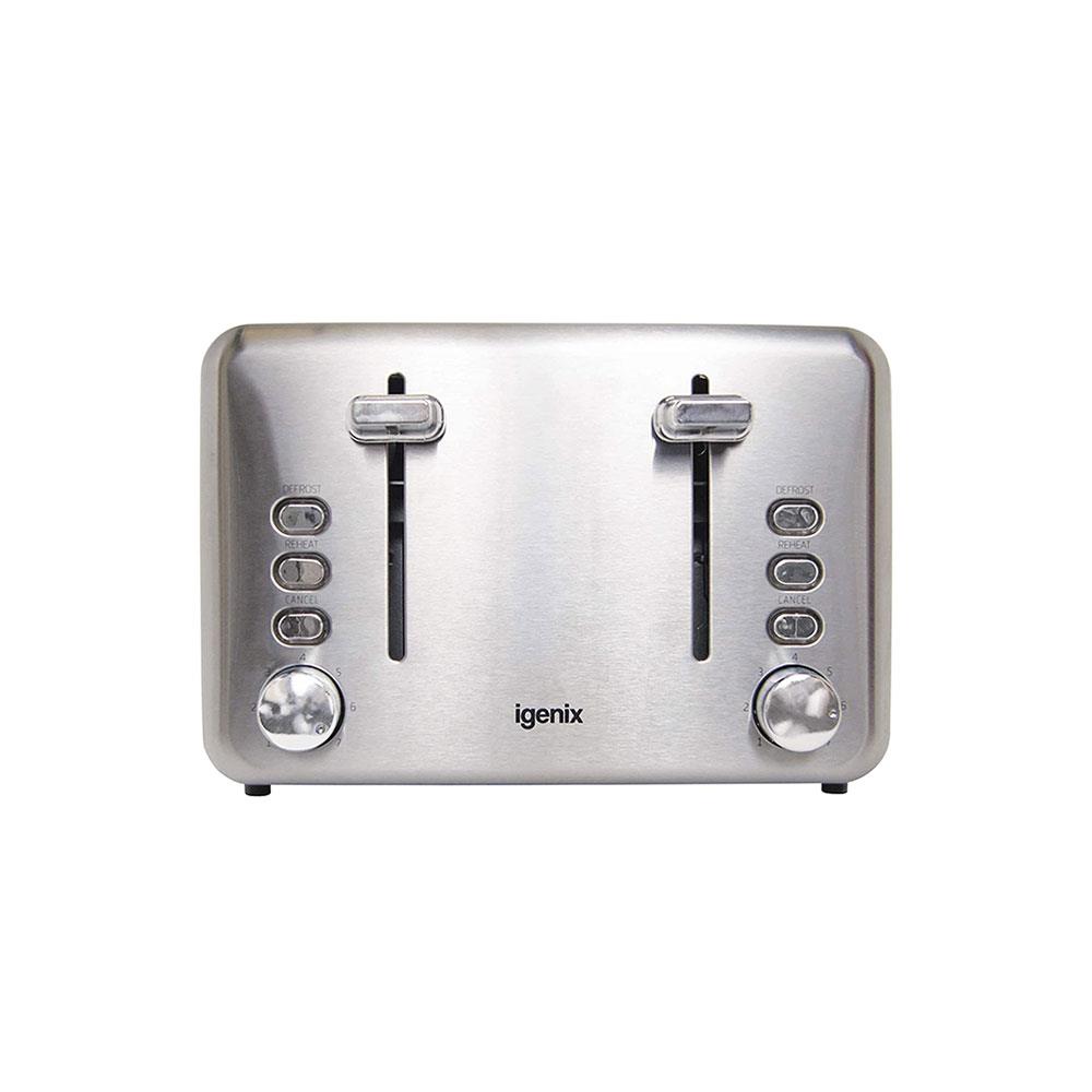 The Igenix IG3204 is a 4-slice toaster. Perfect for a busy family, this stainless steel toaster has 4 toasting slots, as well as variable electronic browning control so everyone can have their toast exactly how they like it. The hi-lift facility means no hazardous fishing for small items such as crumpets, and the self-centering guides mean evenly browned slices every time.