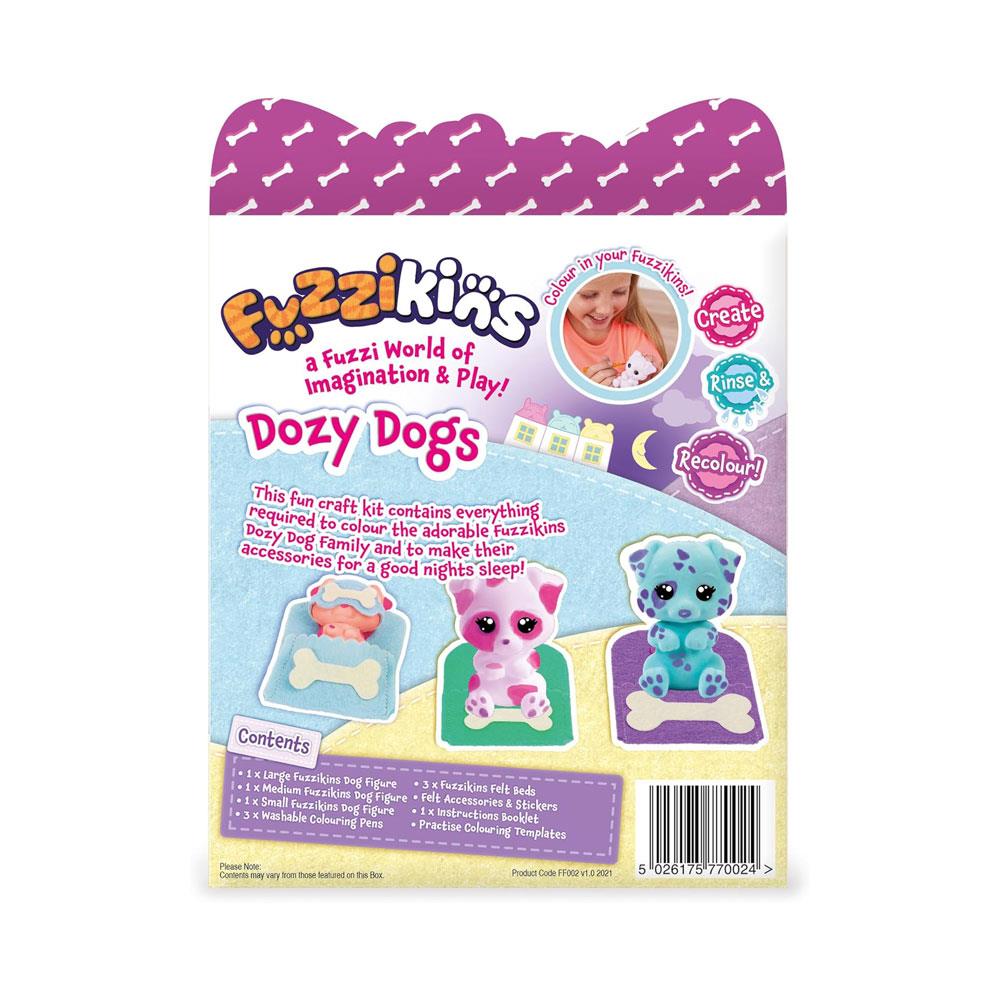 Get ready for bedtime with the John Adams Fuzzikins Dozy Dogs Playset! This adorable craft and play set allows kids to color, decorate, and create their own cozy dog world. Perfect for children ages 4 and up, this playset features three charming, flocked dog figurines that are ready to be customized with colorful washable felt-tip pens.
