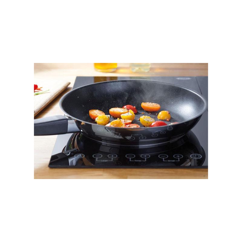 The pan features a tough non-stick coating that allows food to release easily without sticking, helping you cook with less oil and making cleanup quick and simple. Its thermic induction-ready base ensures even heat distribution, delivering reliable cooking performance across a wide range of stovetops including gas, electric, ceramic, halogen, solid plate, and induction hobs.