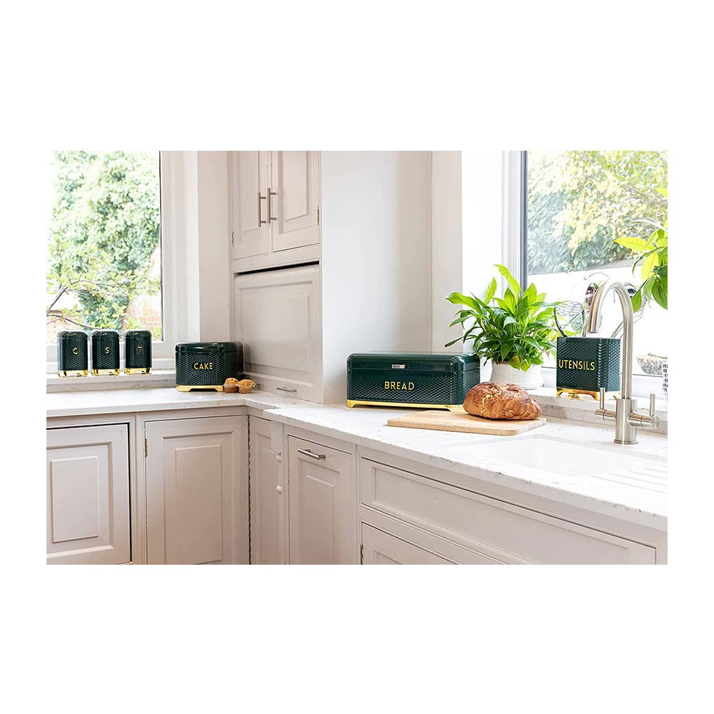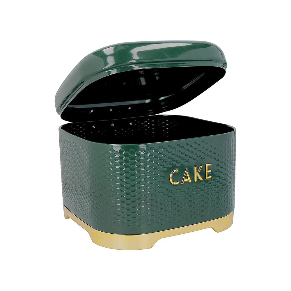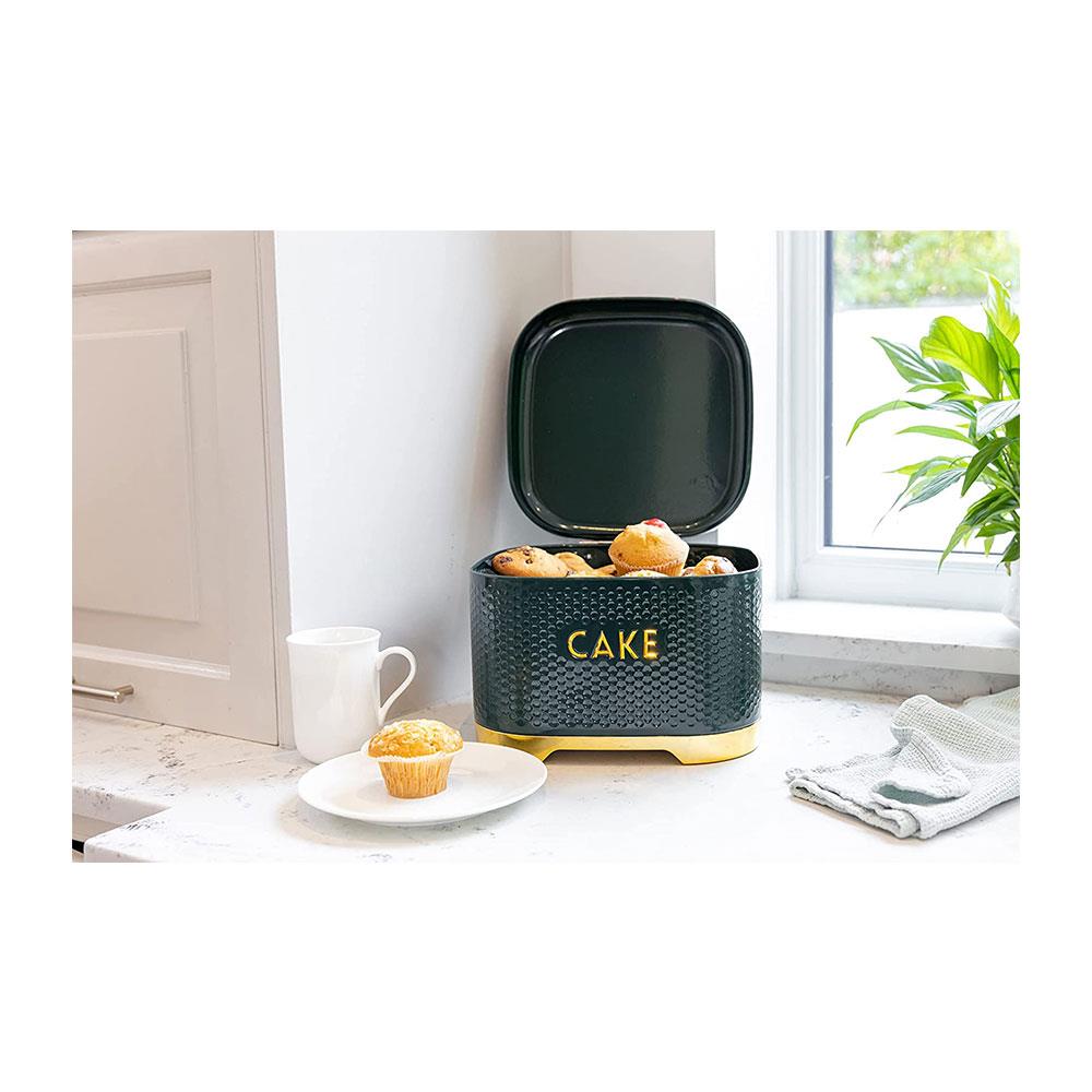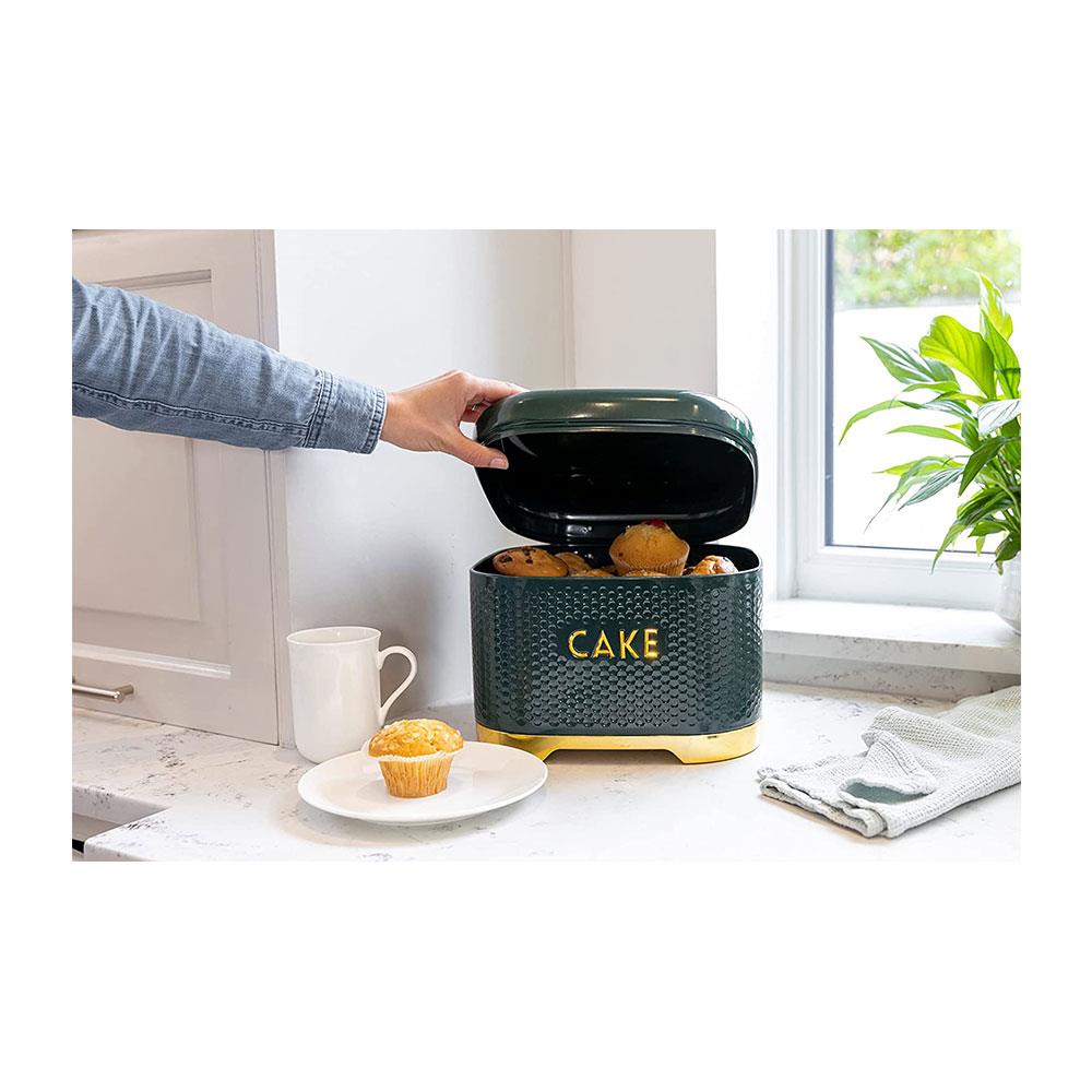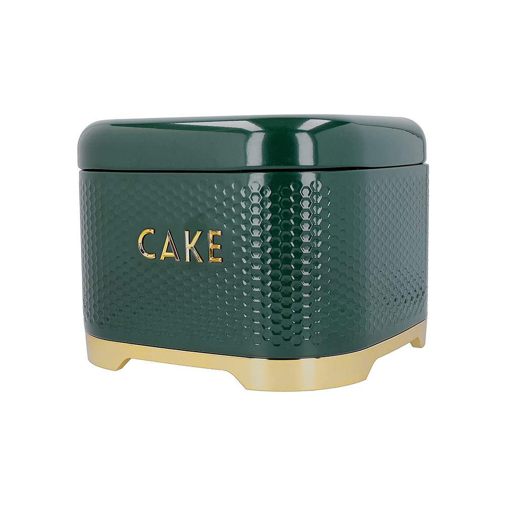 • TEXTURED ELEGANCE: This sleek cake tin is perfect for any kitchen, with smooth curves and pairs an embossed geometric pattern with a rich green color and complimenting brass feet