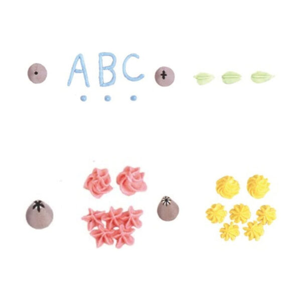 • Eight stainless steel nozzles and 13 stainless steel biscuit cutter templates