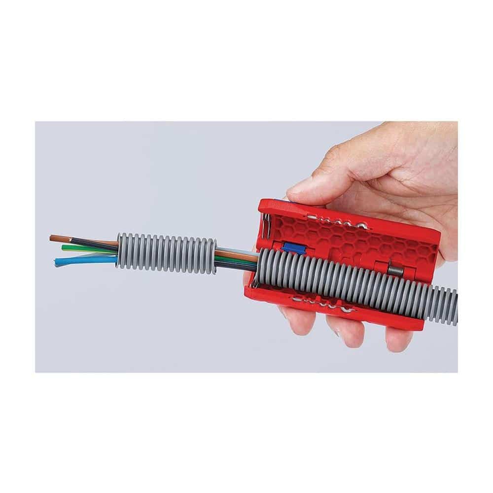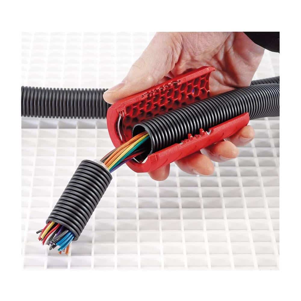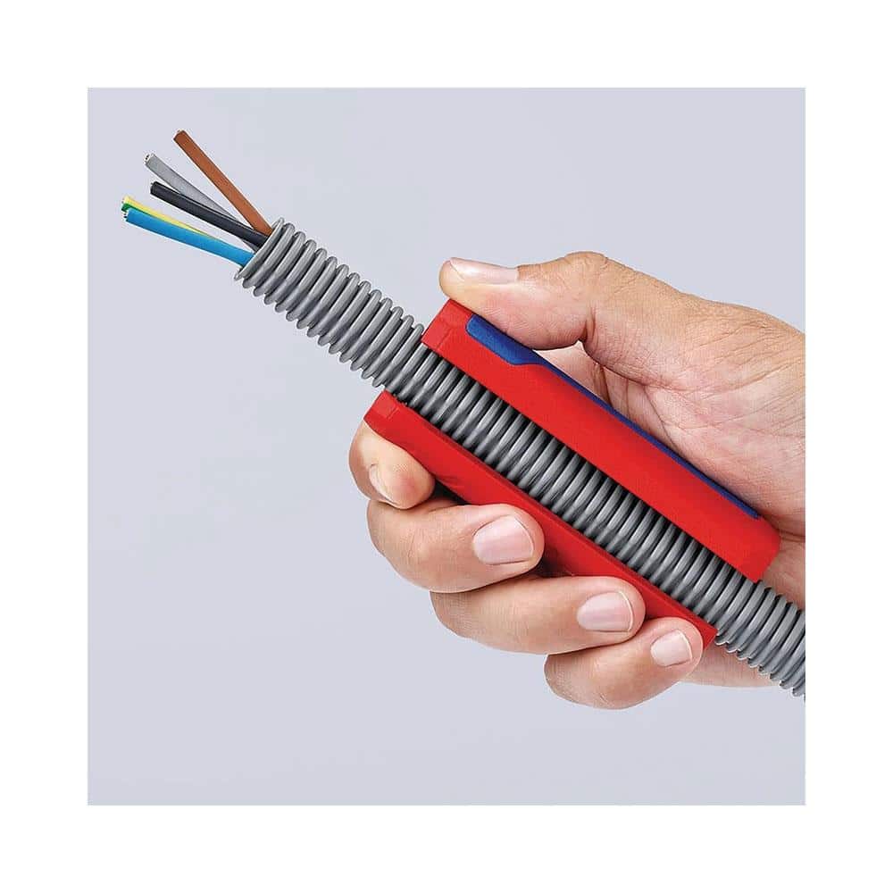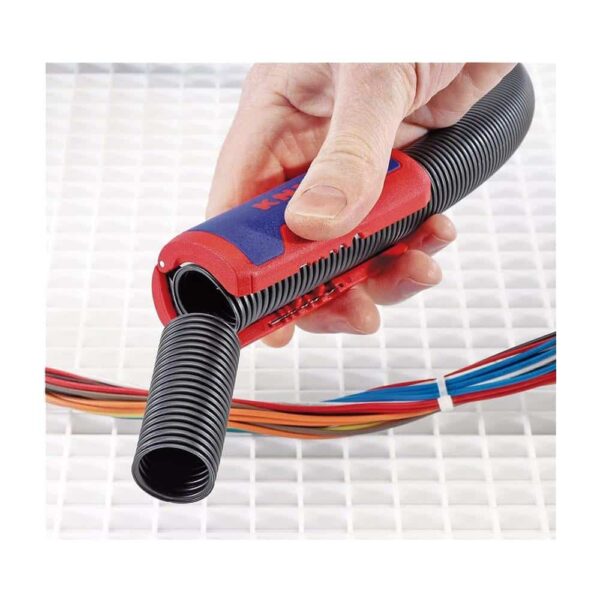 Professional Quality, for cutting empty or ready-assembled corrugated pipes with o/d of 13 – 32 mm to length. The recessed blades prevent injuries whilst delivering an exact, flush cut, without damaging the internal cables. Cuts on the outside of fluting. Simple insertion of the corrugated pipe for reliable cutting. Slim and ergonomically shaped for work in poorly accessible areas. Double-sided guide for a precise cut.