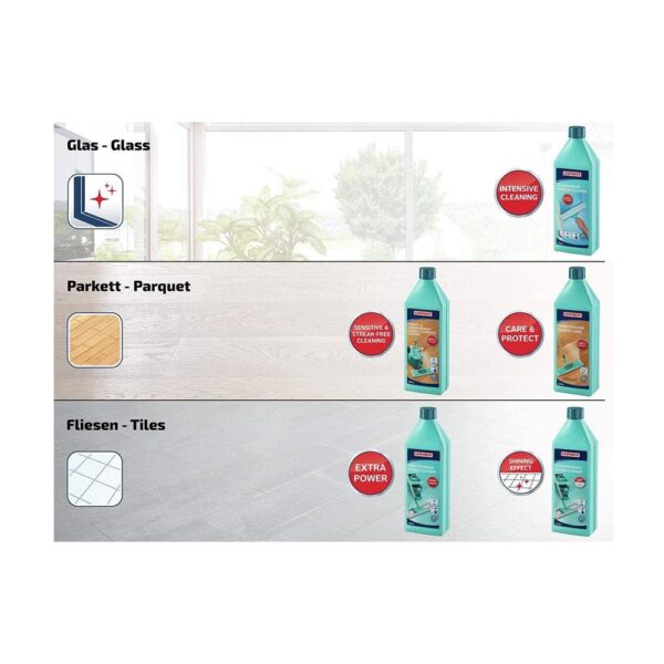 Whether for the regular intensive base cleaning or for the removing of dirt after renovations – with Leifheit Power Cleaner even persistent dirt has no chance. The special Power-mixture removes heavy soiling from tiles and stone floors on the inside and on the outside. Even old cleaning product coatings can easily be removed. Available in the 1 l bottle with child safety catch. With the whole competence for cleaning devices Leifheit offers a series of cleaning agents, which are perfectly coordinated with the special covers.