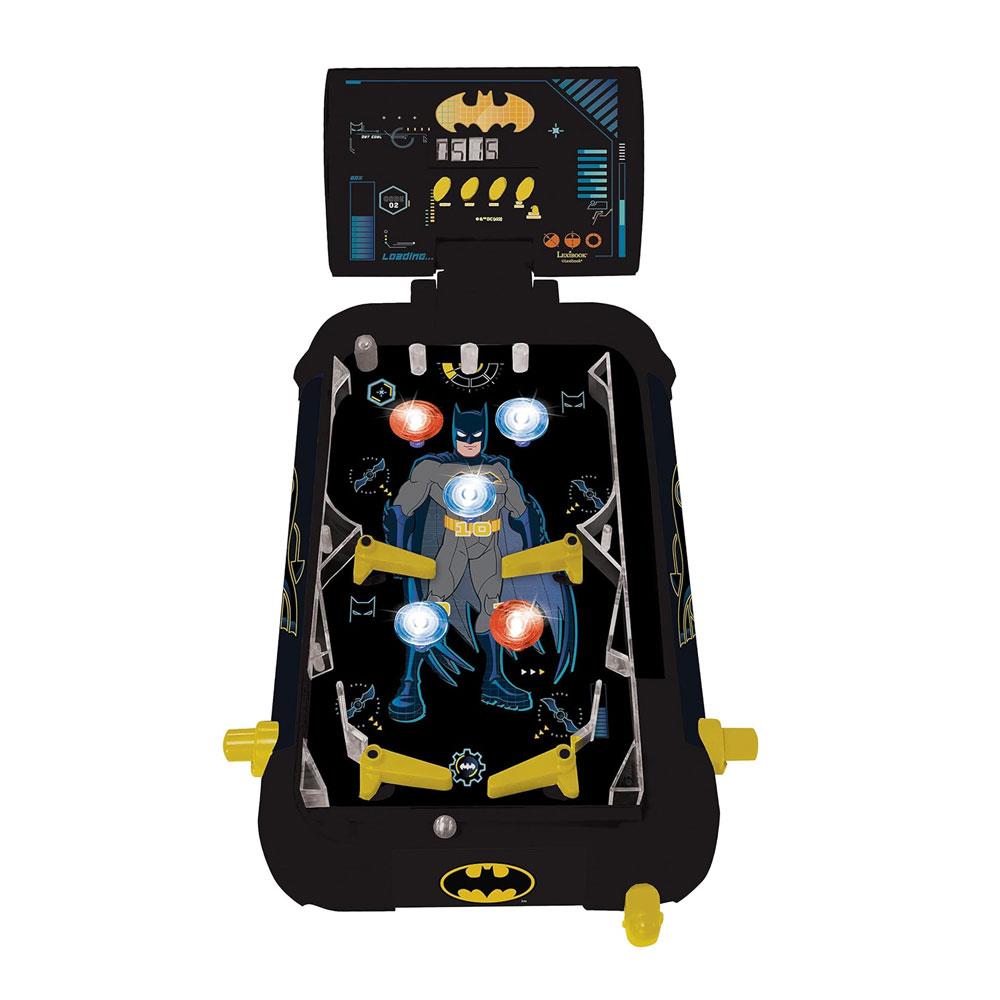 Lexibook JG610BAT Batman Electronic Pinball with Lights & Sounds A great Batman design for training or challenging friends! Fun sounds and lights true to the traditional pinball game 4 pinball games and 5 luminous obstacles 1 ball included inside the game 1 reset button 2 feet to tilt the pinball machine and an ideal playing angle Digital score display Works with 3 LR14 batteries