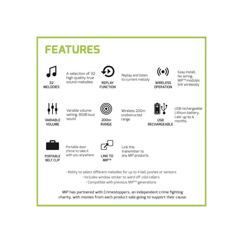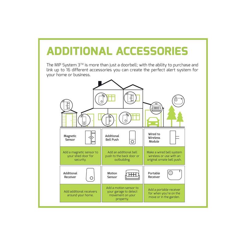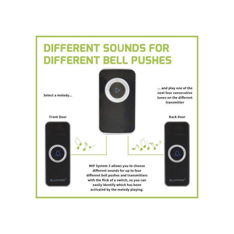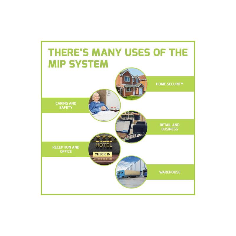 Part of the MIP System 3, this kit can be expanded by linking up to 16 compatible MIP accessories, including additional bell pushes, PIR motion sensors, and magnetic door sensors. Each transmitter can be assigned a different melody, helping you instantly identify where alerts are coming from.