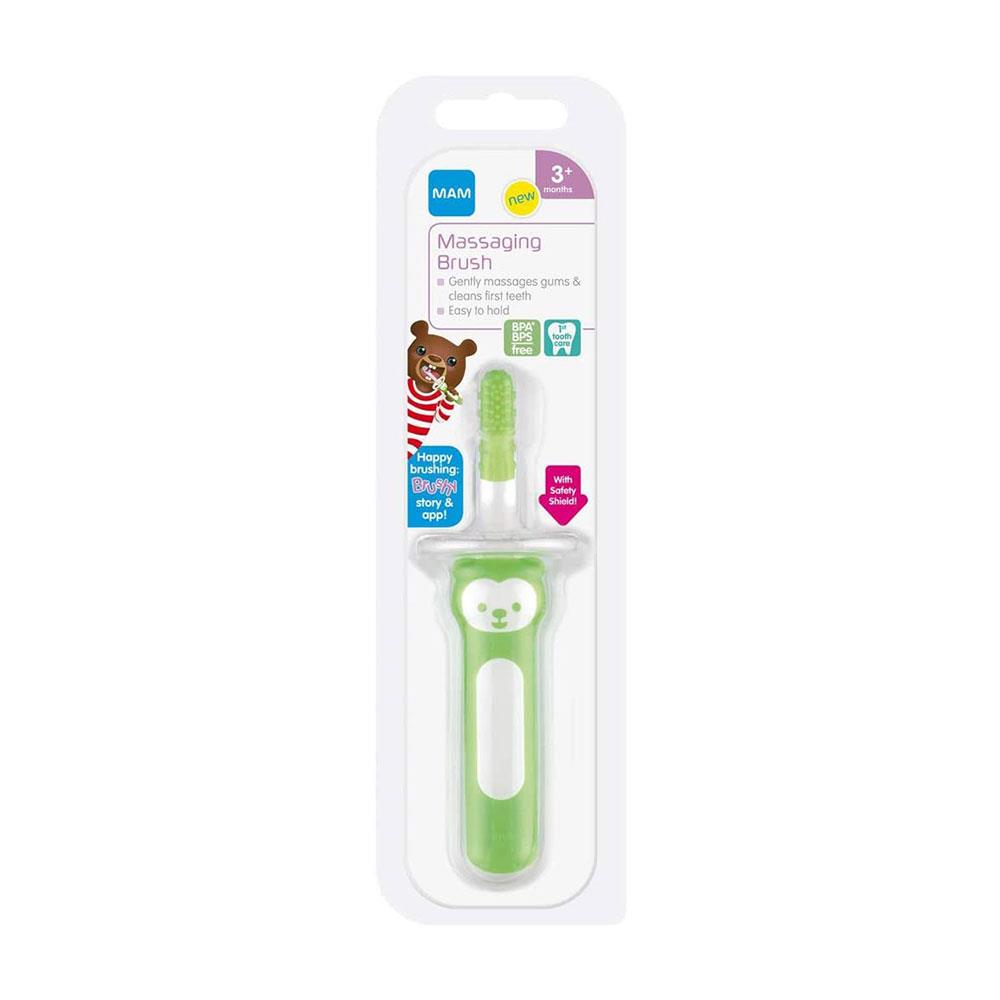 MAM Massaging Brush Cleans and Massages sensitive gums & Teeth The MAM Massaging Brush works perfectly in two ways, cleaning and massaging gums and first teeth. Soft TPE bristles and the massaging structures work together to remove plaque and bacteria as well as ease the discomfort brought on by teething. Our innovative safety shield is simple yet effective, keeping the brush from reaching the back of your child’s mouth and preventing choking. Thanks to this safety measure the process of learning to brush is made a better experience for babies. Before long your newborn boy or newborn girl will be ready to set aside their Massaging Brush and move on to one of MAM’s advanced MAM baby toothbrushes.