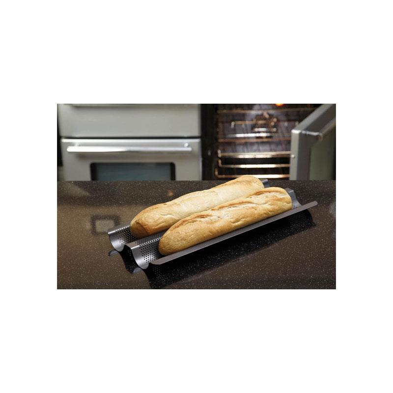 The tray features a two-cavity design that securely holds two regular baguettes in the perfect shape while baking. Its innovative perforated surface allows moisture to escape and hot air to circulate freely around the dough, helping create a crispy crust with no soggy bottoms. Even after removing from the oven, your bread continues to crisp for a beautifully golden finish.
