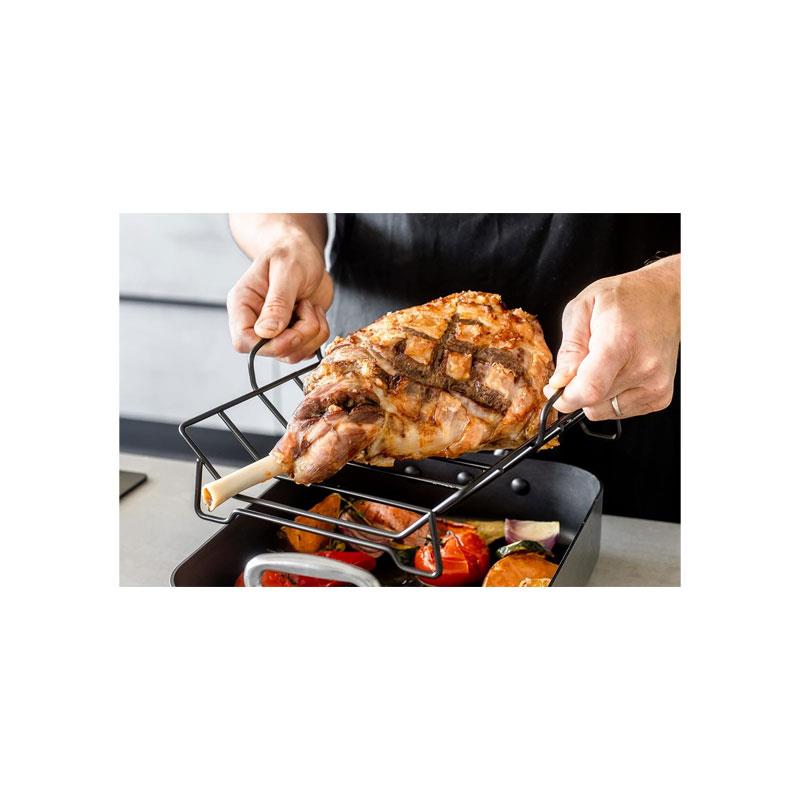 A removable roasting rack elevates meat to ensure even cooking while allowing excess fat to drain away for healthier results. The juices collect neatly in the base for rich homemade gravies. Designed for versatility, it is hob-to-oven safe (excluding induction), and features strong side handles for secure handling from stove to oven.