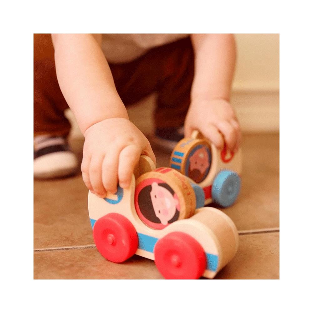 • Roll, stack, and grasp 2 double-sided wooden GO Tots friends and make them spin in 2 numbered wooden race cars