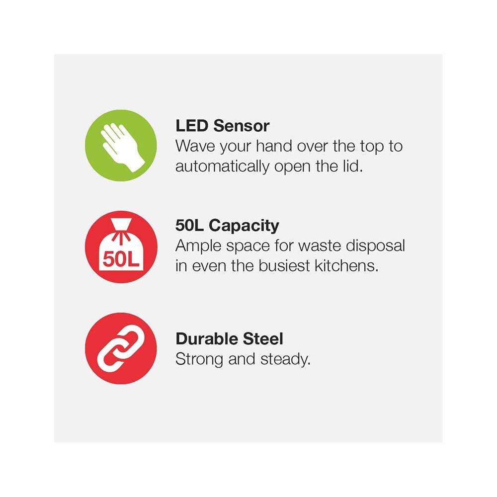 • MOTION SENSOR TECHNOLOGY: The lid opens automatically as you get closer, then closes after 5 seconds of inactivity, for hygienic waste disposal