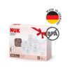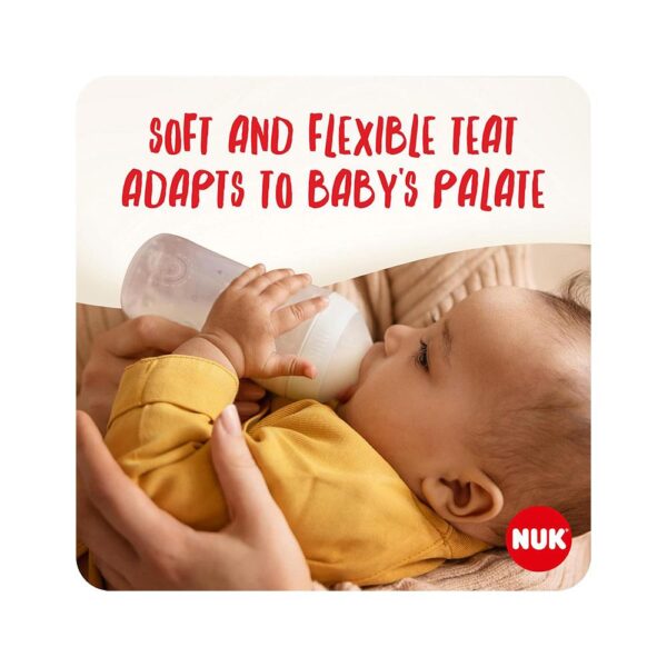 Ensure your baby gets the best start with the NUK Perfect Start Set, featuring 4 baby bottles, 2 replacement teats, 1 bottle brush, 1 silicone soother and 1 carry case. The NUK Perfect Match baby bottle is simply right for baby, thanks to its adaptive design. The bottle teat is uniquely soft and elastic, just like mum’s skin, so that it gently moulds to any baby’s lips and palate. The smoothly tapering shape also makes it easy to latch on in the right way: mouth wide open with lips enclosing the teat. The Innovative Anti-Colic vent helps prevent the harmful swallowing of air, with 3 teat size options that regulate milk flow in the best way for your baby. Ensuring baby’s milk is the perfect temperature is simple thanks to the built-in Temperature Control Indicator on the side of the bottle that changes colour from blue to white when the bottle’s contents are too hot***. Also included is the NUK Star soother that soothes 99% of babies****, with an extra-soft zone at the top that nestles gently against the palate, as well as a reusable carry case that can be used for microwave cleaning, plus the 2in1 Bottle Brush that effectively cleans both bottles and teats. *Independent market research, Germany, 2023 **Independent market research, Germany, 2023 ***Always check the temperature before feeding ****Independent market research, Germany, 2020