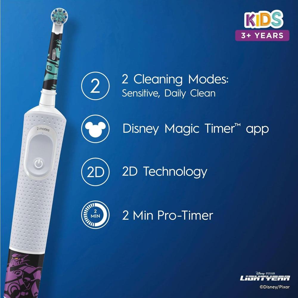 The Oral-B Kids electric toothbrush for ages 3+ gives kids the fun of Disney Lightyear with the gentle, effective clean of a dentist-recommended Oral-B toothbrush. With 2 brushing modes including a unique, kid-friendly sensitive mode, this brush gently cleans kids’ teeth. It removes more plaque than a regular manual toothbrush. Four Disney Lightyear-themed stickers are included to customize the handle.