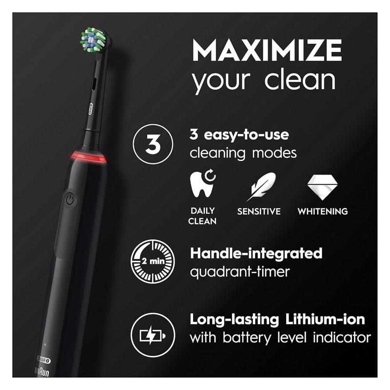 The Pro 3 3900 features three easy-to-use brushing modes—Daily Clean, Whitening, and Sensitive—to suit your unique oral care needs. With the round Cross Action brush head, it surrounds each tooth for a dentist-level clean that manual brushes can’t match.