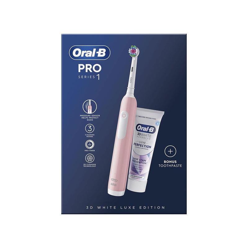 Oral-B Pro Series 1 Cross Action Electric Toothbrush With 3D White Luxe Perfection Toothpaste 75ml Pink