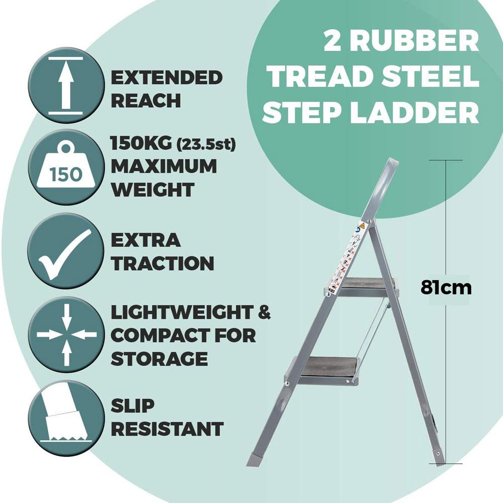 OurHouse 2 Rubber Tread Steel Step Ladder 150kg Maximum Weight Slip-Resistant Feet - Grey - Image 3