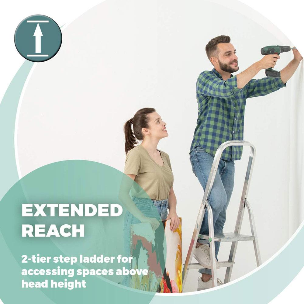• EXTENDED REACH: A 2-tier step ladder provides a boost in height for accessing high-up cupboard spaces, cabinets, and shelving units