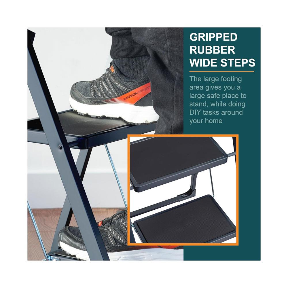 • Rubber Feet for Extra Stability: Equipped with non-slip rubber feet, the ladder ensures a stable grip on various surfaces, preventing unwanted movement. This makes it suitable for use indoors and in the garden, even on smooth or uneven surfaces.