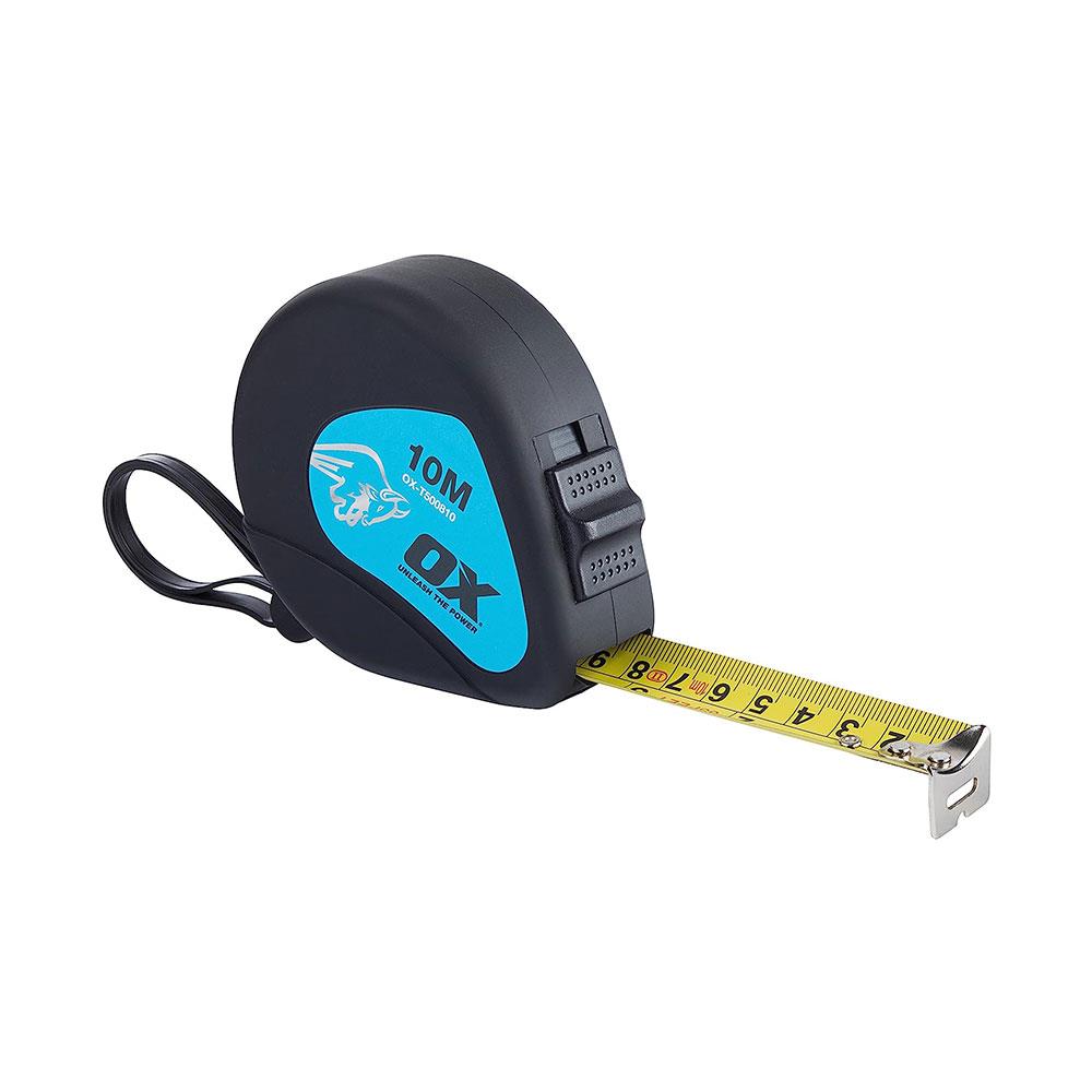 The OX Trade 10M Tape Measure comes in a DURAGRIP molded rubber case with a 25mm wide nylon-coated steel blade with metric-only markings. Features shock-absorbing blade return bumper, easy slide thumb lock, and includes a handy belt clip.