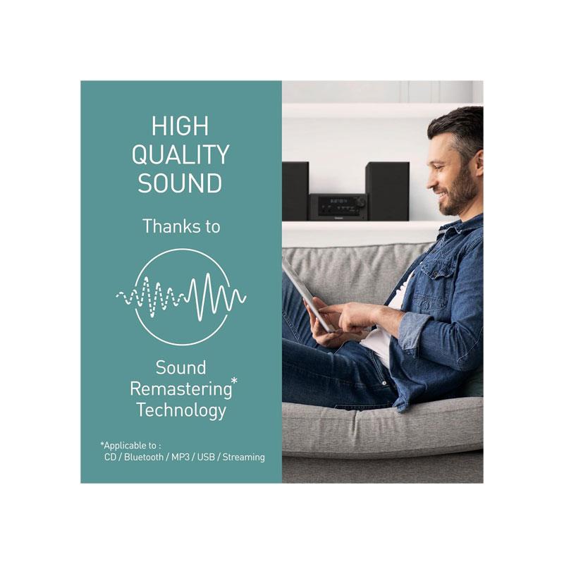 Featuring Panasonic Sound Remastering Technology, the system reduces distortion in digital audio playback, improves sound image localisation, and delivers music closer to the artist’s original intent. The 80W output with 2-way speakers, 10cm woofers, and 6cm tweeters ensures rich bass, clear vocals, and balanced treble for all music genres.