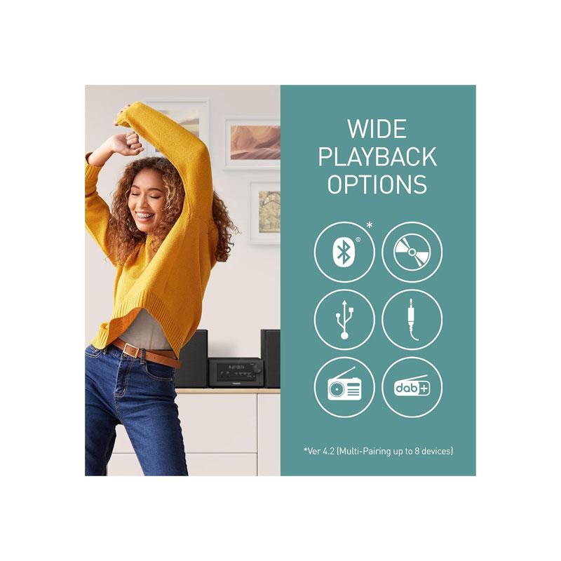 Built-in Bluetooth connectivity allows wireless streaming from smartphones, tablets, and other compatible devices, making it easy to enjoy playlists, podcasts, and online audio services without cables. For traditional listening, the system supports CDs, USB devices, and DAB+/FM radio, offering versatile playback options in one compact unit.