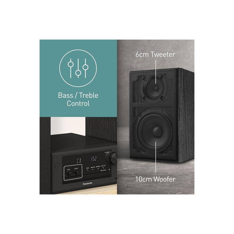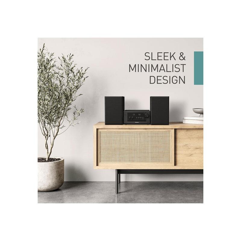 The sleek, minimalist black design blends seamlessly with any interior, while the intuitive control surface and tactile rotary dials provide simple operation. With separate bass and treble controls and Panasonic’s ‘My Sound’ preset modes, you can customise audio settings for music, speech, or background listening.
