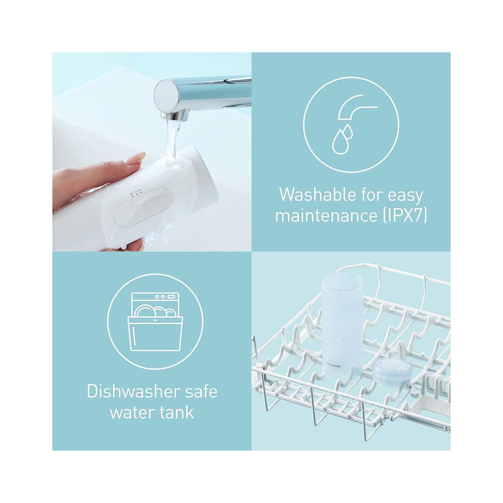 The main unit of the travel oral irrigator is IPX7 waterproof. Both the tank and the cover are dishwasher-safe to allow for thorough cleaning.