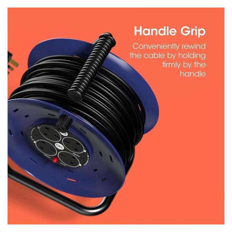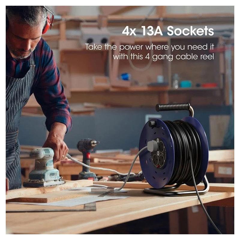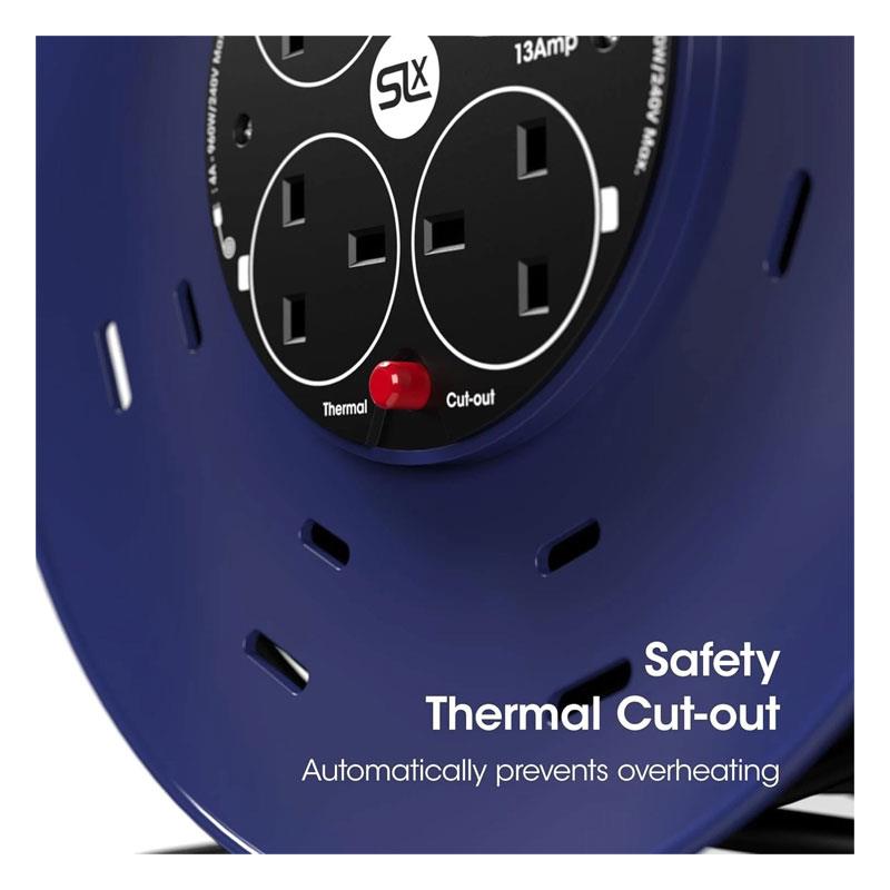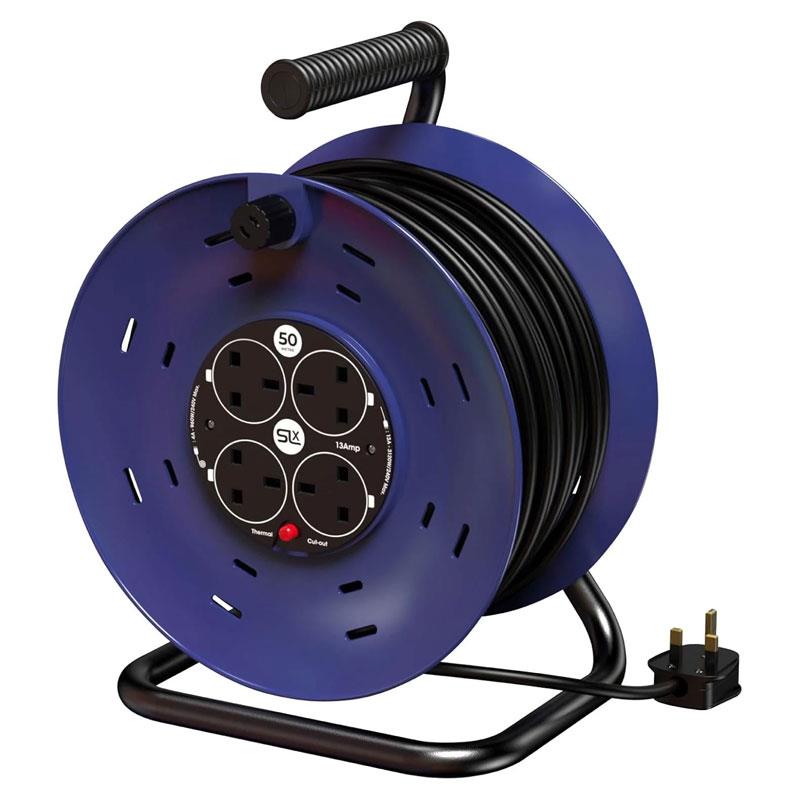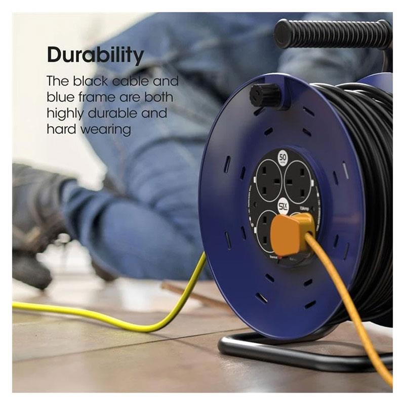 SLx 50m Heavy Duty Extension Reel – 4 Way 13A Cable Reel with Thermal Cut-Out (Black & Blue)