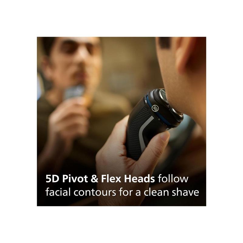 It features 27 self-sharpening PowerCut blades that cut up to 55,000 times per minute, trimming hair just above skin level for a clean, even finish. The 5D Pivot & Flex heads move in five directions to follow the natural curves of your face, ensuring consistent contact for better shaving performance.