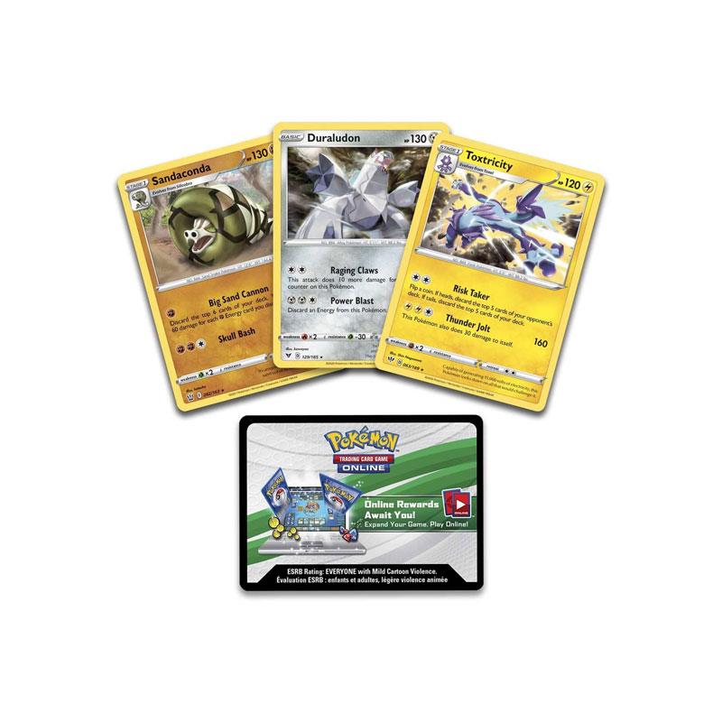 The Pokemon TCG Knock Out Collection featuring Toxtricity, Duraludon, and Sandaconda is a perfect expansion set for Pokemon Trainers and collectors. This official Pokemon Trading Card Game collection brings together three popular Pokemon from the Galar region as foil promo cards, offering both collectible value and gameplay utility.