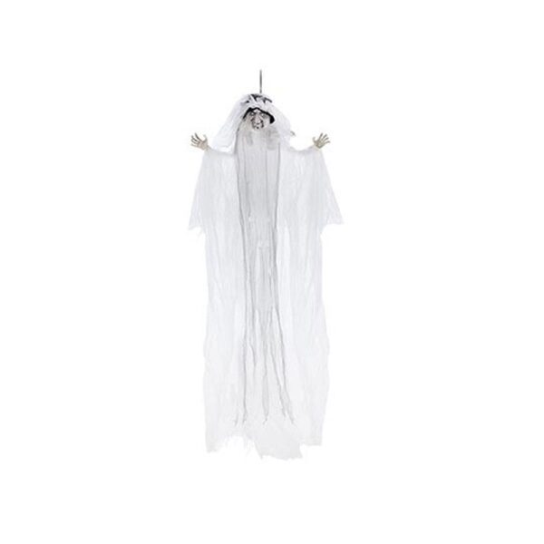 Premier  Hanging Ghost Witch – 2m From our huge and impressive collection of Halloween decorations and spooky dungeon props, this is our hanging Ghost Witch which is an impressive 2mtrs or 79″ tall. This impressive piece, which would look fantastic against a wall or gently catch the breeze outside, comprises a large white hanging Ghost Witch which has a long trailing chiffon dress. This gnarled-faced witch comes with poseable arms and is ready to hang wherever you want to place it within your own Halloween scene or party area. Another piece, that if looked after will last years