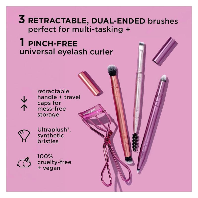 Your ultimate on-the-go eye makeup set! The Real Techniques Double Time Brush + Lash Set features 3 dual-ended brushes and a Miracle Eyelash Curler for creating flawless eye looks anywhere, anytime. Perfect for travel or daily use, this versatile kit has everything you need to define, blend, and lift with ease.