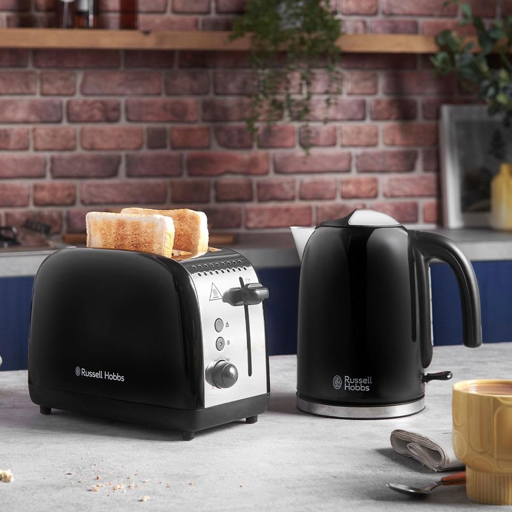 Colors Plus 20413 Jet Black Kettle By Russell Hobbs As interiors continue to take their inspiration from the catwalk, pops of color remain a real style trend in kitchen spaces. Whether you want to blend in or liven up your kitchen, the Russell Hobbs Colors Plus kettle and toaster breakfast range promises to provide value with the uncompromised quality and performance you’d expect.