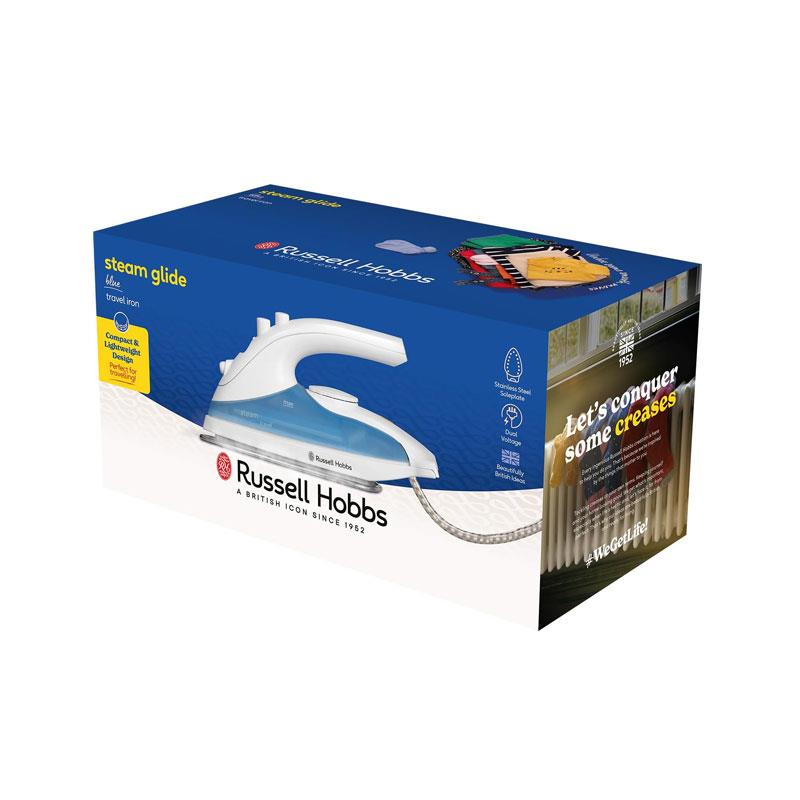 Home / Home & Kitchen / Small Appliances / Irons / Russell Hobbs Dual Voltage Steam Glide Travel Iron 830W Stainless Steel Soleplate 80ml Tank Water Spray Variable Steam White And Blue