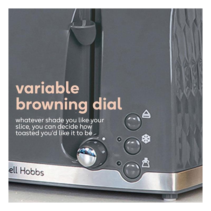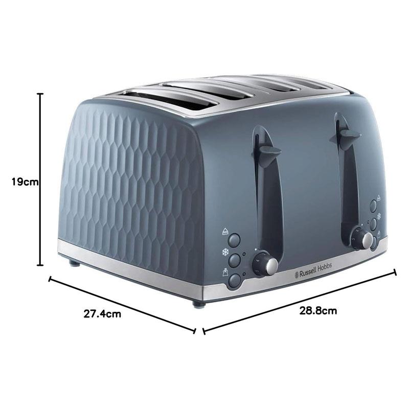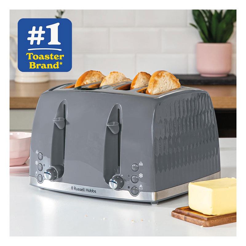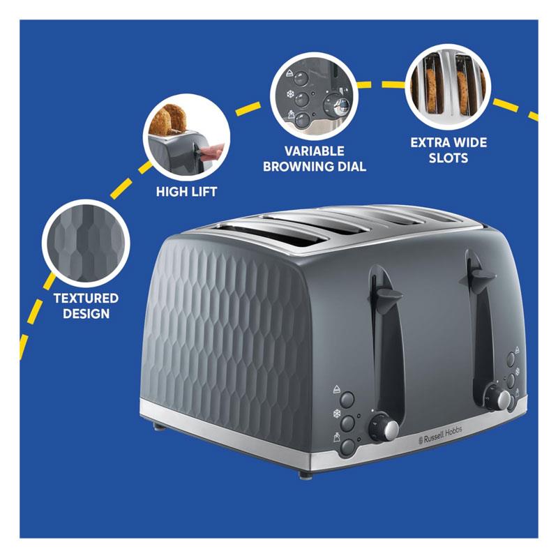 Russell Hobbs Honeycomb 4 Slice Toaster Grey | 6 Browning Levels, Extra Wide Slots, High Lift & Crumb Tray – 1500W Stylish Textured Toaster UK