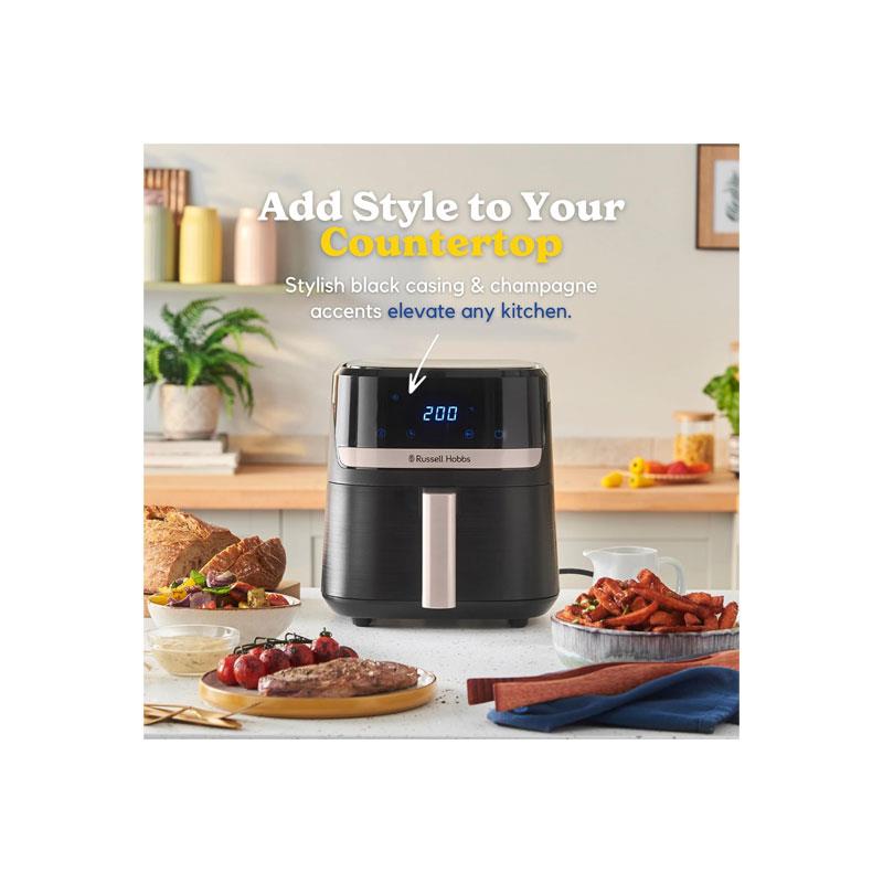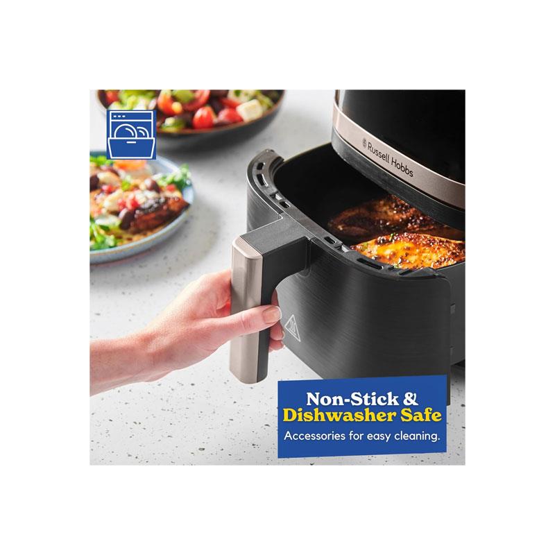 Cleaning is easy thanks to the dishwasher-safe basket and crisping plate. Finished in a sleek black and champagne design with a compact footprint, it fits perfectly into modern kitchens while delivering powerful performance.