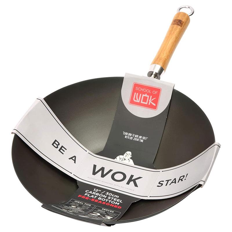 School of Wok 12 Inch/30cm Pre Seasoned Carbon Steel Flat Bottom Wok With Bamboo Handle – Black