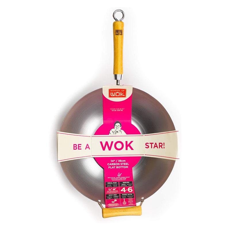 School of Wok 14-Inch / 36cm Uncoated Carbon Steel Wok – Authentic Stir-Fry Pan with Bamboo Handle, Silver