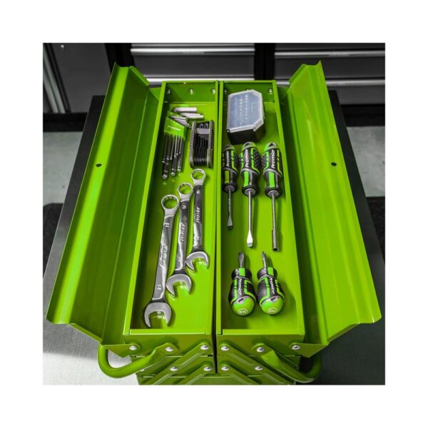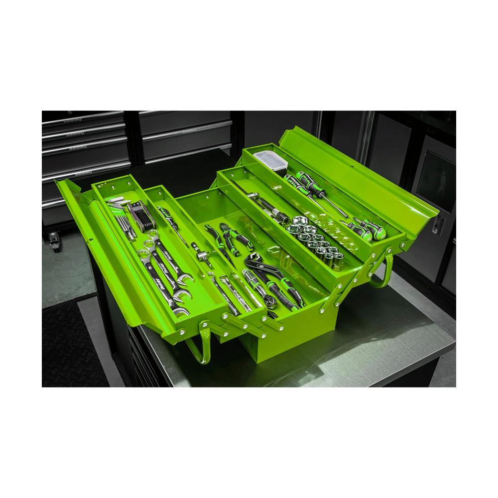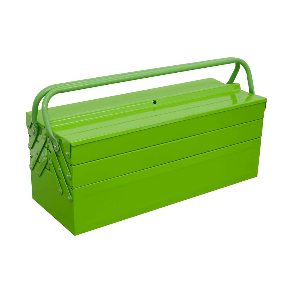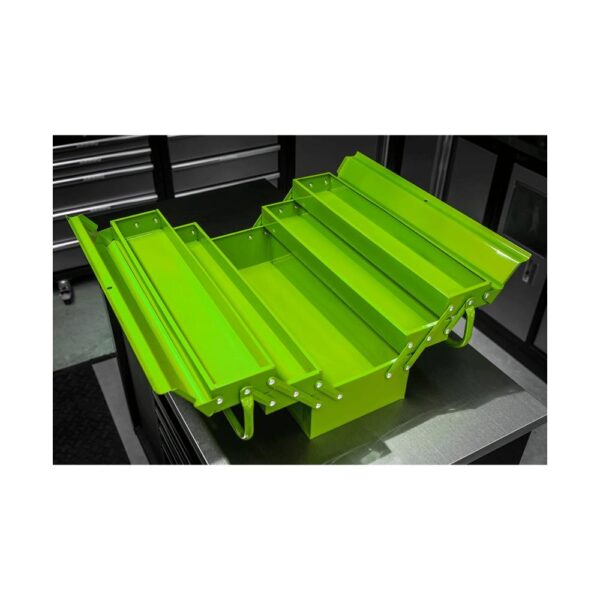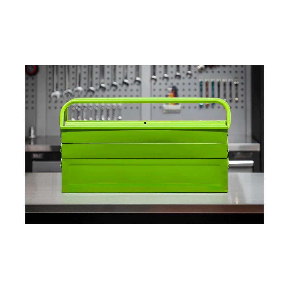 Hi-visibility green. Traditional cantilever design with four tool trays and central tool storage area. Top flaps accept padlock (not supplied), for extra security.