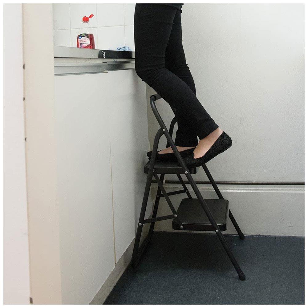 Folding 2-tread step stool with strong, tubular steel frame and deep-drawn reinforced steel plates. 150kg load capacity and Maximum platform height of 430mm, enabling extended reach during painting, cleaning, changing lightbulbs, and all kinds of tasks around the home. Powder-coated for corrosion resistance with ribbed treads to guard against slipping.