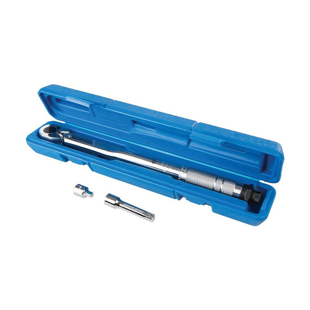 Torque Wrench By Silverline Chrome vanadium steel with reversible ratchet head Knurled adjustment handle & locking ring for precise torque settings Manufactured by EN ISO 6789 & DIN 3121 – Accuracy +/- 4% Range 8 – 20-110 & resolution 1Nm Includes 75mm extension bar, 3/8″ – 1/4” drive adaptor (62Nm max) & storage case