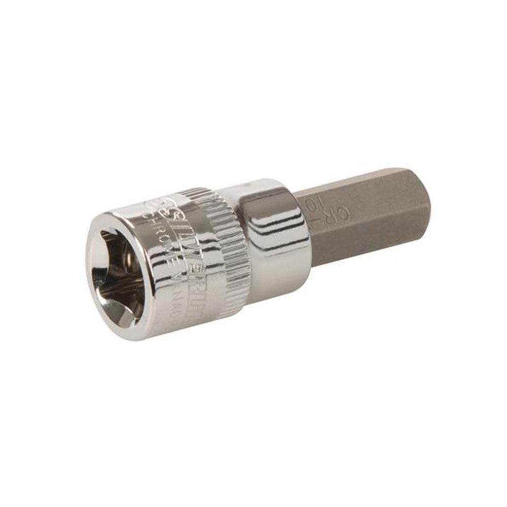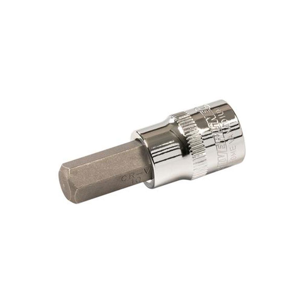 Hardened and tempered hex bits with a satin finish, mounted in polished chrome vanadium square drive sockets. Contents: hex 3, 4, 5, 6, 7, 8, and 10mm.