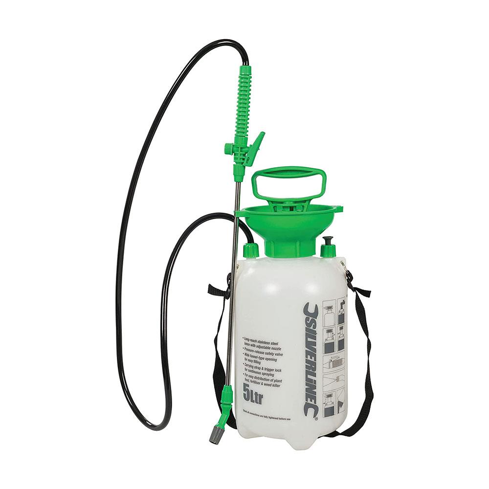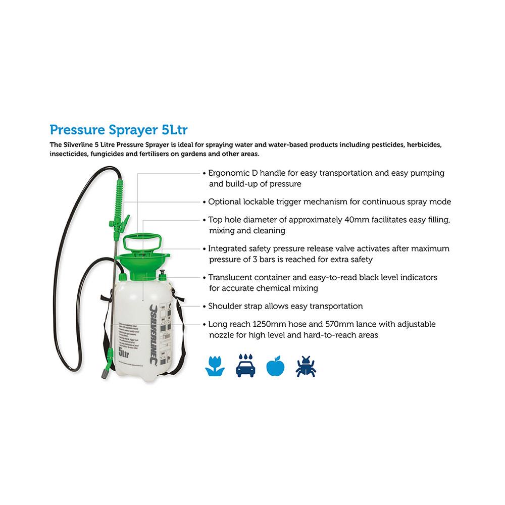 A portable pressure container, specifically designed to make spraying lawn and plant feed, fertilizer, weed killer, or just water quick and easy, the Silverline Pressure Sprayer holds up to 5 liters of liquid, making it sufficiently light to carry and maneuver, yet large enough to contain just the right amount of water-based fluids. The long-reach stainless steel lance with an adjustable nozzle and trigger lock lets you reach high trees and bushes, or access ground-levelSilverline Pressure Sprayer 5 Liters in Assorted Colors, Long-reach stainless steel lance with adjustable nozzle, and Pressure-release safety valve shrubs and plants.